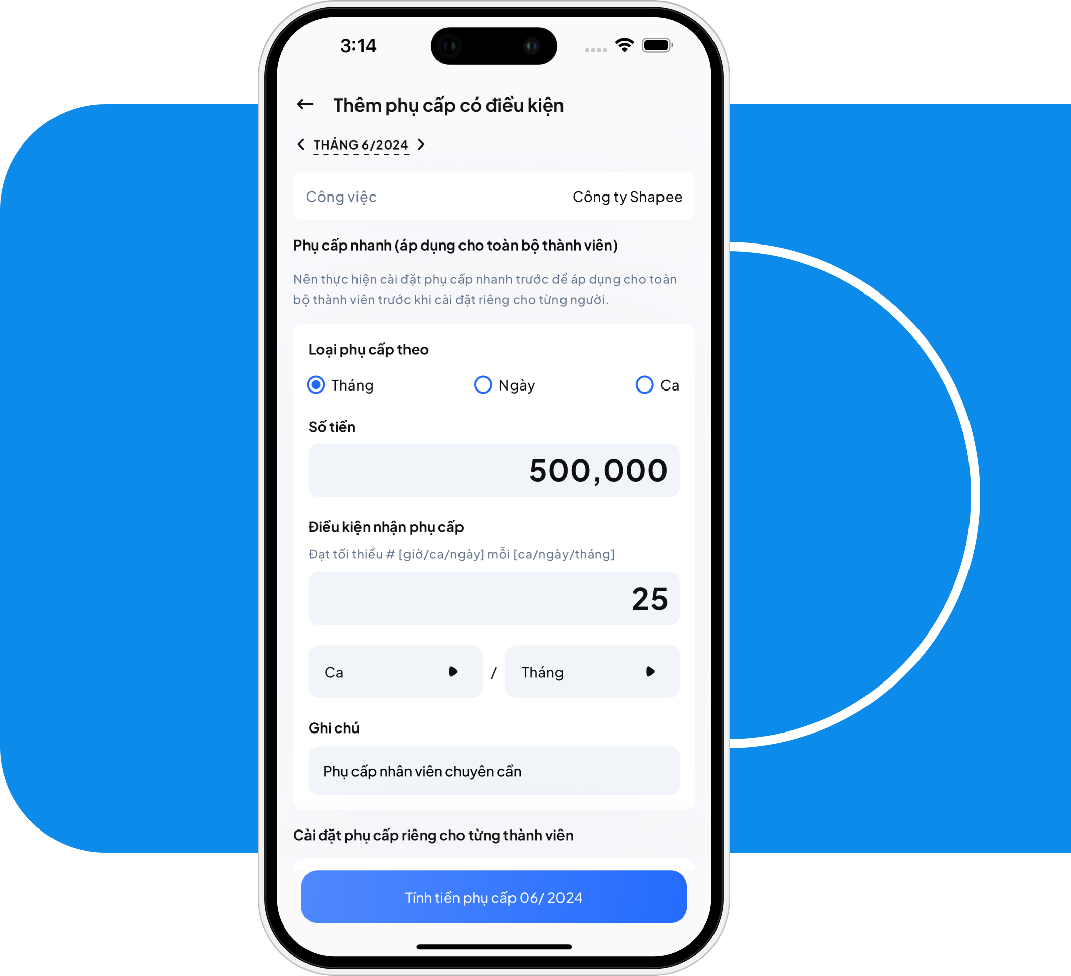 Hiểu được những hạn chế của việc tính phụ cấp "một cỡ" cho tất cả nhân viên, ứng dụng của chúng tôi cung cấp hệ thống tính Phụ cấp linh hoạt, đo ni đóng giày cho nhu cầu riêng và đa dạng của từng nhóm người dùng. Thiết lập phụ cấp hàng tháng cho chi phí đi lại, phụ cấp bữa ăn, hoặc cho các khoản phụ cấp đặc thù ca kíp đòi hỏi thêm chênh lệch như ca đêm hoặc cuối tuần.