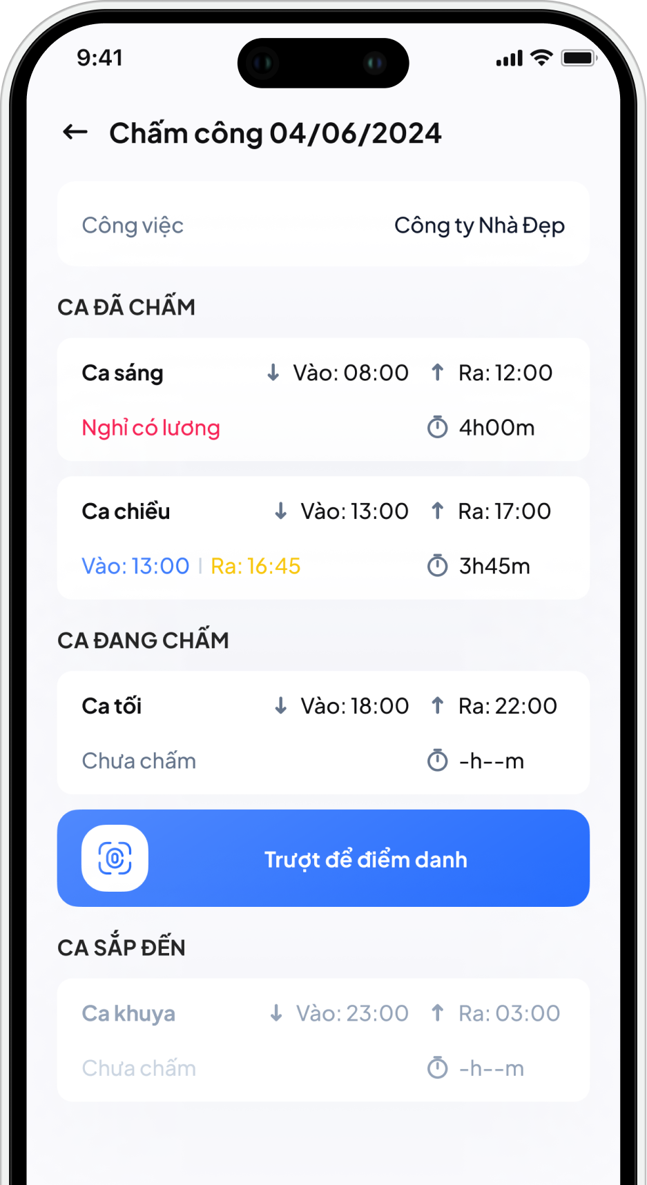 Tạo ca và xếp ca làm việc linh hoạt.
